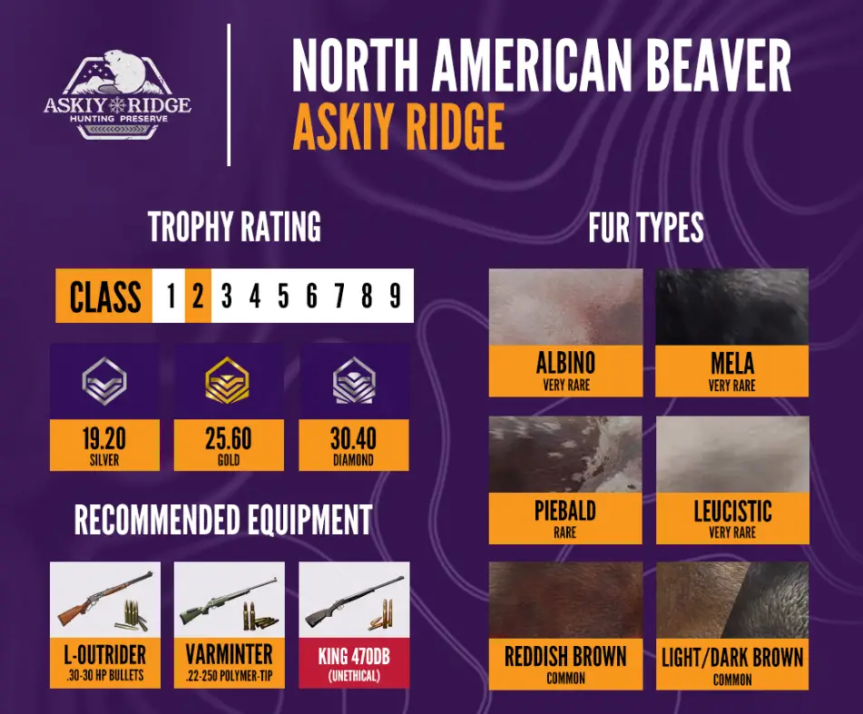 North American Beavers are most commonly found in light, reddish, or dark brown fur variations, making these the standard sights during a typical hunt. However, the is a selection of rare fur types that stand out significantly from the others. Among these, piebald beavers are already a rare find with their distinctive patchy colouring, but even more elusive are the melanistic, leucistic, and albino variants.